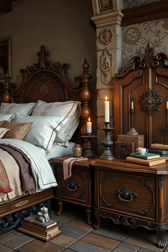The furniture I incorporate in this kind of bedroom is carved wooden wardrobes, wrought iron bedframes and chests with ornamental detailing. These objects are functional and also act as visual cues so that the room will be immediately identifiable as Castlecore-inspired.