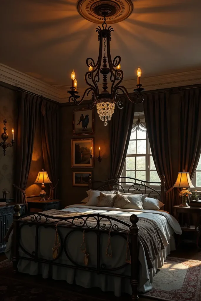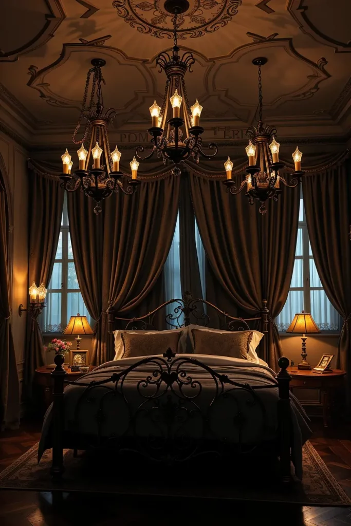 I would suggest wrought iron chandeliers that have several arms in larger bedrooms and wall-mounted sconces in small rooms. The inclusion of dimmable bulbs will make the lighting either dramatic or warm, depending on the time of the day.