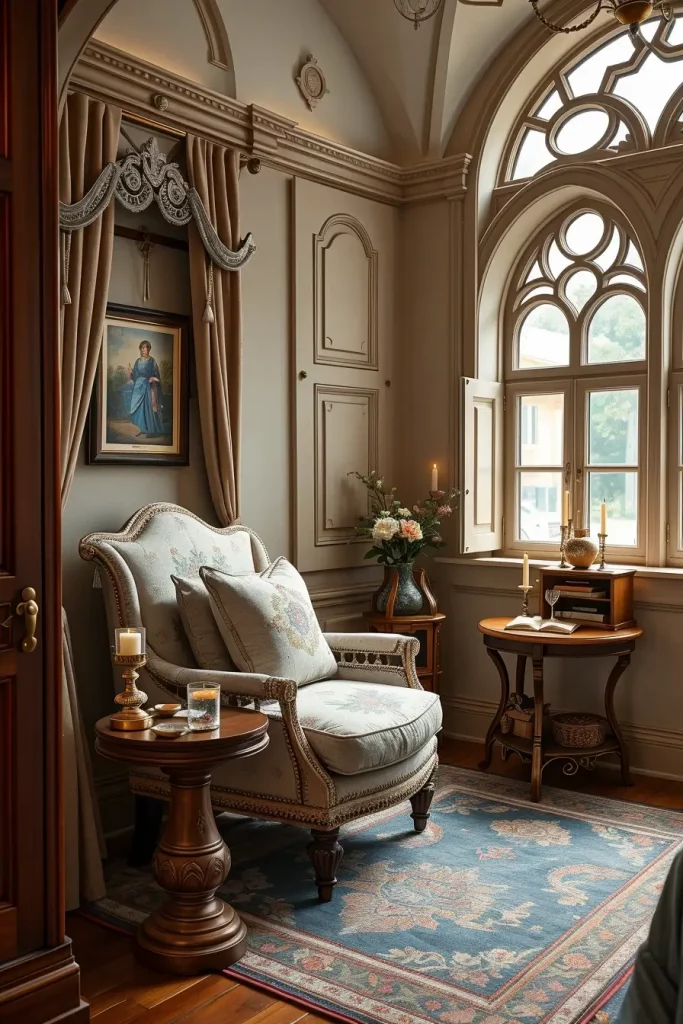 I have created reading nooks using high-backed chairs or small wooden benches, stacked cushions, and embroidered throws. The setup is finished with a small side table on which candles or a cup of tea can be placed. The historical theme is enhanced by the addition of a bookshelf nearby, which contains leather-bound books or replicas of antique books.