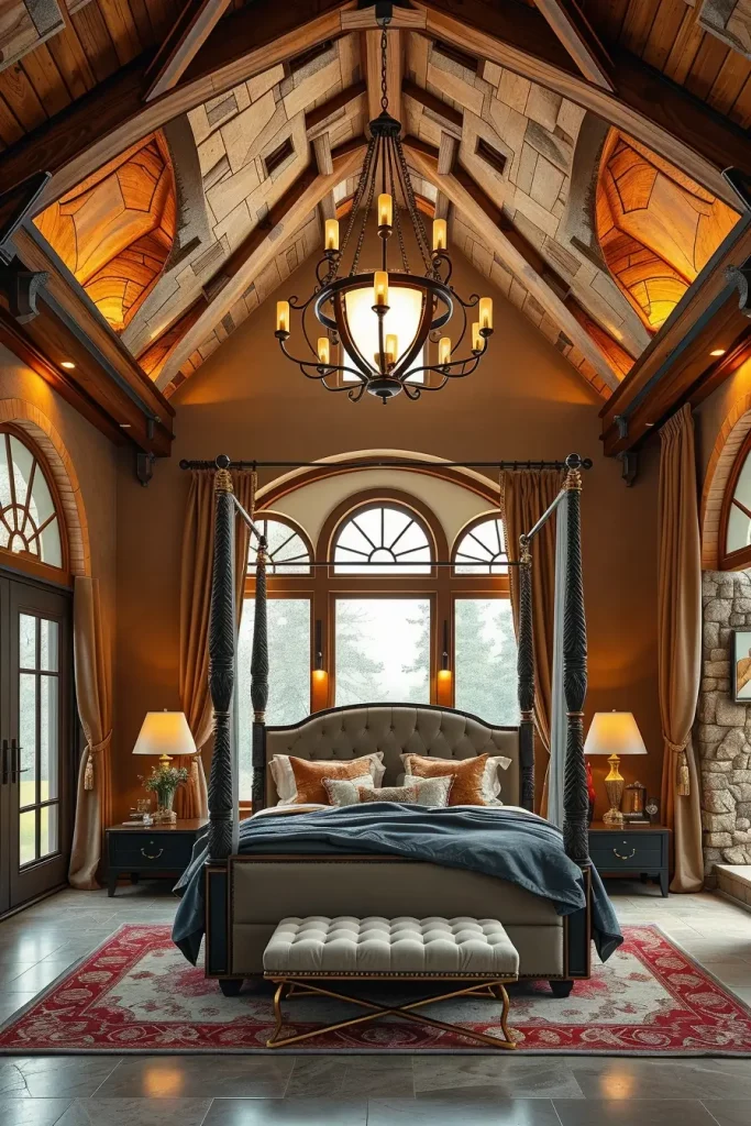 The ceiling is one of the most remarkable Castlecore design characteristics. I have discovered that a vaulted ceiling, wooden beams or faux stone textures instantly provide a bedroom with that royal feel. Arched doorways and windows contribute to the feeling of grandeur, and the room seems to be timeless. Such details might sound lavish, yet, they contribute to the comfort of the space as they attract the eye upwards and provide depth.