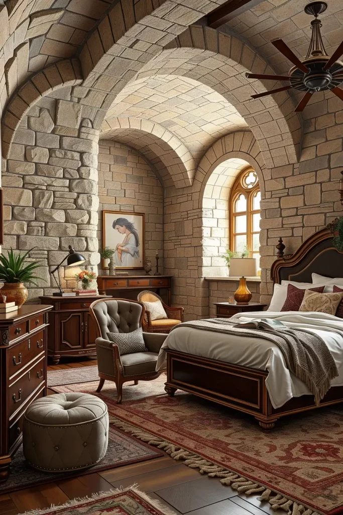 When the space is too heavy, I would recommend the use of light fabrics or mirrored surfaces to balance the stone walls. This makes the design practical and still preserves the royal background.