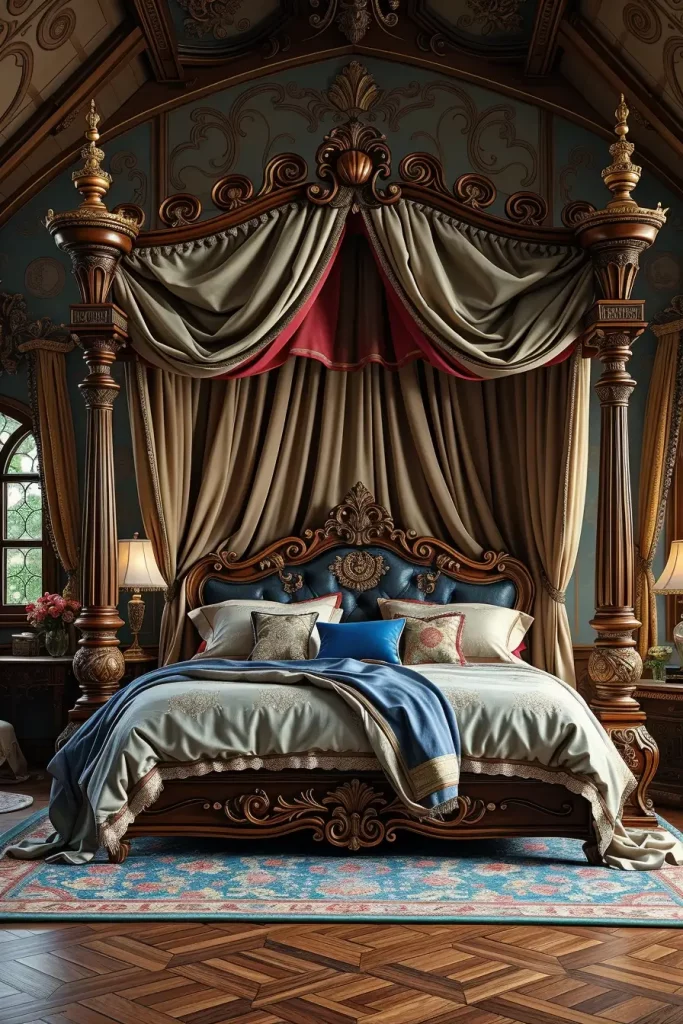 I would use dark wood or wrought iron frames, layers of fabrics, such as velvet or silk. Even the posts themselves are carved with details, which add to the design and connect it with the rest of the decor.