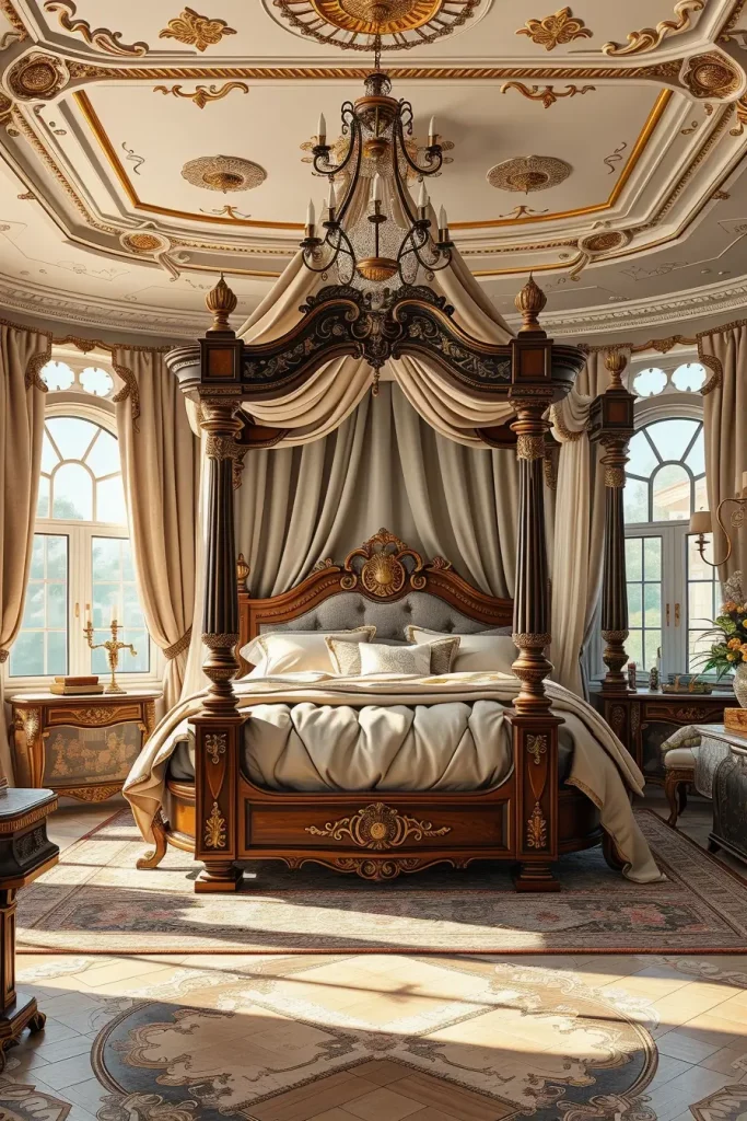 I usually augment these beds with bedding velvet throws, silk sheets, embroidered pillows. The canopy height will attract the eye upwards to create a perception of greater space which is particularly helpful in smaller bedrooms.