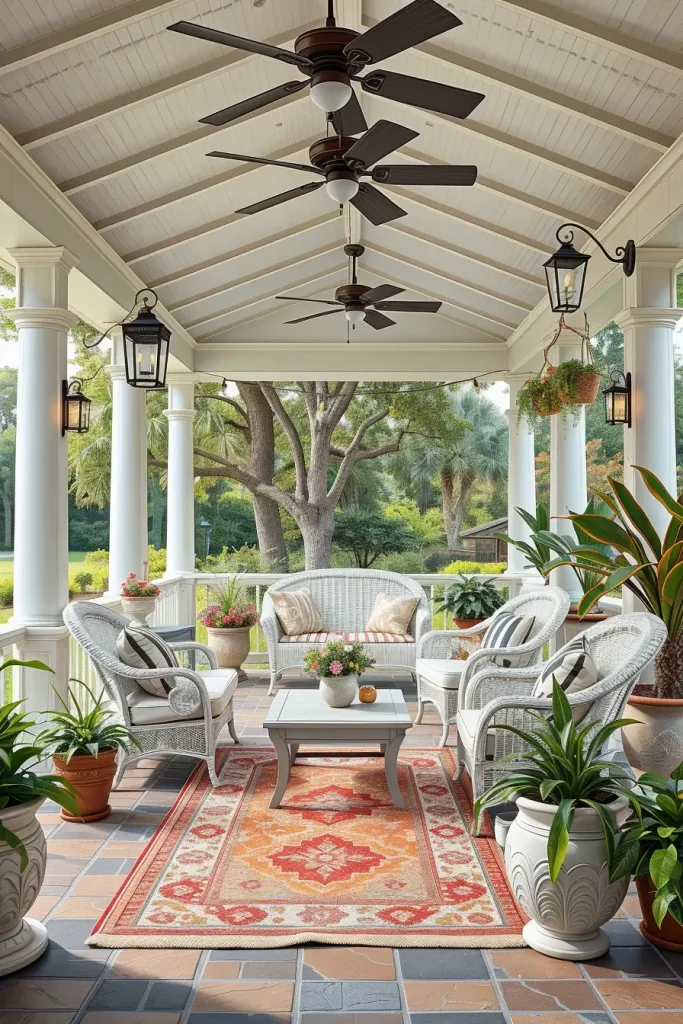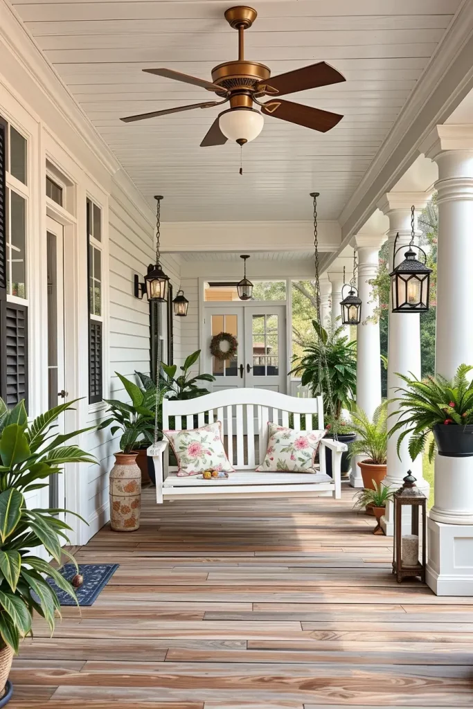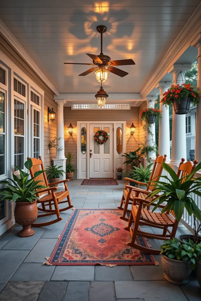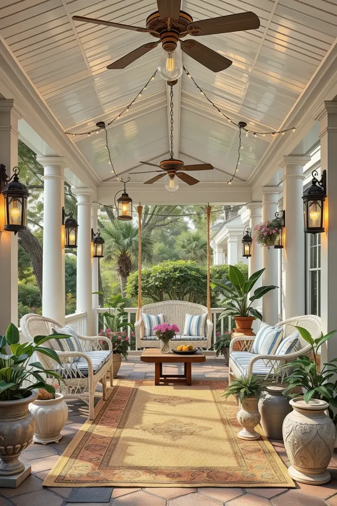 In my view, there’s no way to finish a Southern patio without adding plants and the right lights. I placed some white globe string lights on a covered veranda and they softly enhanced the image, activating the space in an enjoyable way. I found out from Southern Living that you can put citronella candles in classic-looking lanterns and keep the bugs from coming while your home benefits from a touch of vintage charm.