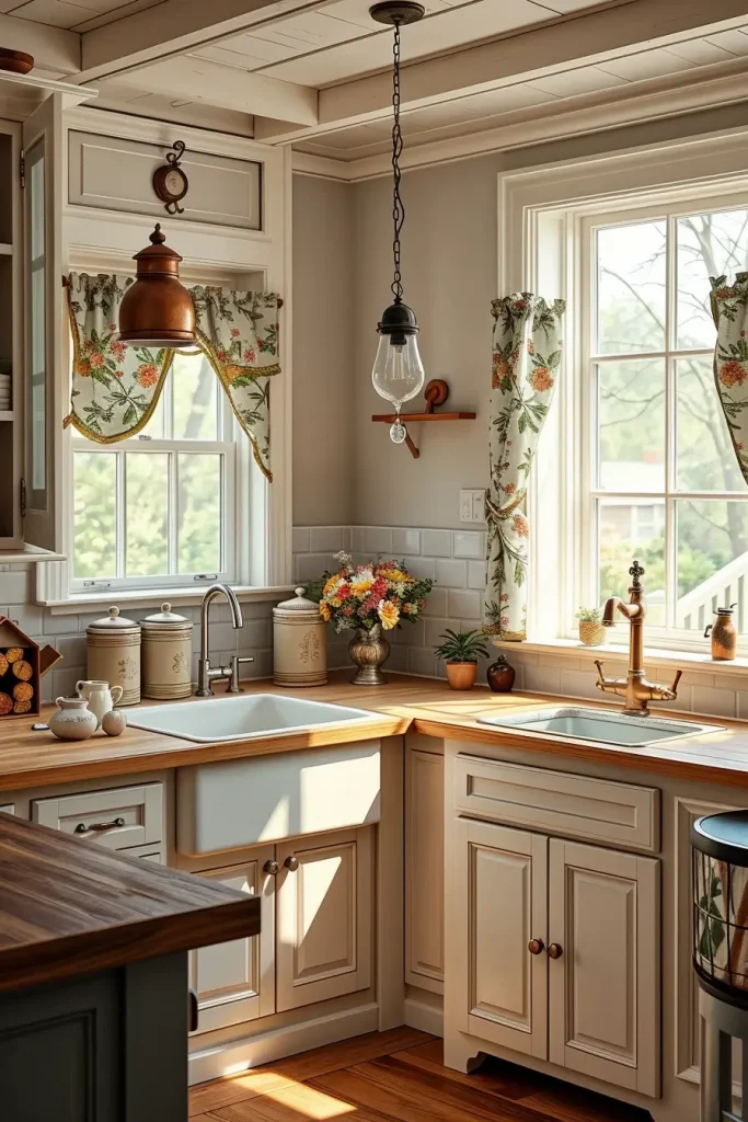 A sink with floral curtains or a garden look out the window can make it the center of attention. I prefer using maple or oak as my counter material, sealed with food-safe oil. Ceramic canisters, a cast iron skillet rack and a vintage looking faucet will make your space reflect tradition perfectly.