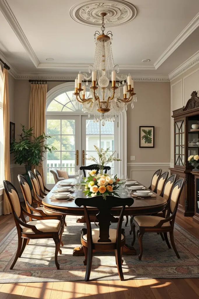 The highlight of any Southern dining room is a classic chandelier. All my dining room designs include a statement piece such as a pendant lamp made of crystal, brass or antique bronze with long arms and bulbs. It brings style and excitement, making people look higher.
