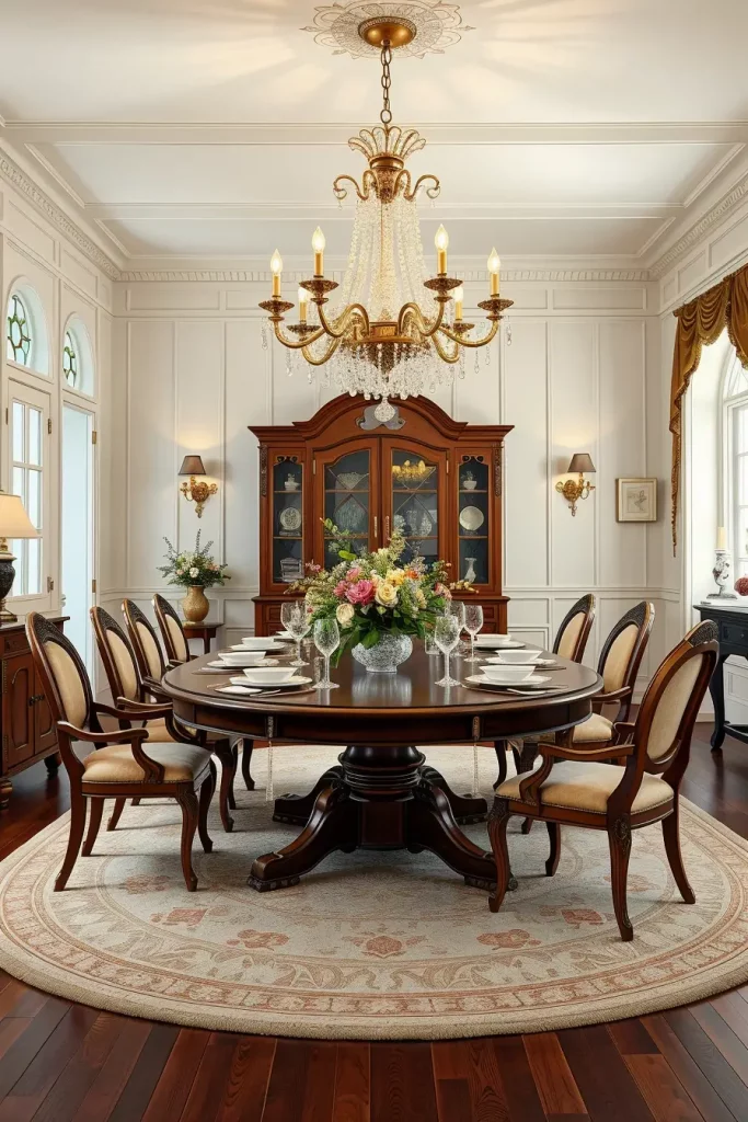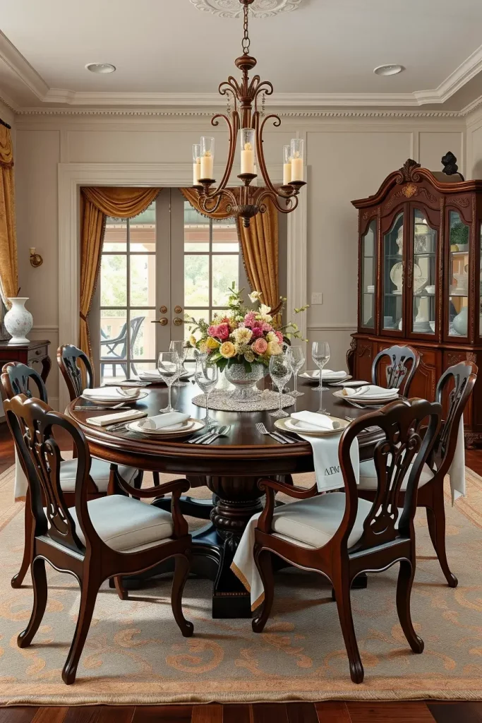 I tend to set the chandelier right above an oversized wooden dining table which is often an oval or a rectangle that can seat eight or ten people. A good rule is to have the chandelier centered above the table, between 30 and 36 inches above it for the best results. Accompanying a centerpiece of flowers, linen napkins and china will make the whole setting truly stunning.