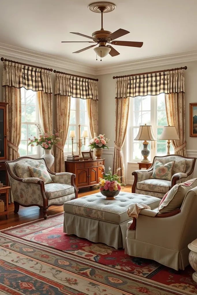 You should mention that bringing in small-scale and large-scale gingham prints into a room adds dimension, but will not overpower the place. Be sure to show how complementary colors can help tame the strong patterns sometimes found in Mediterranean rugs.