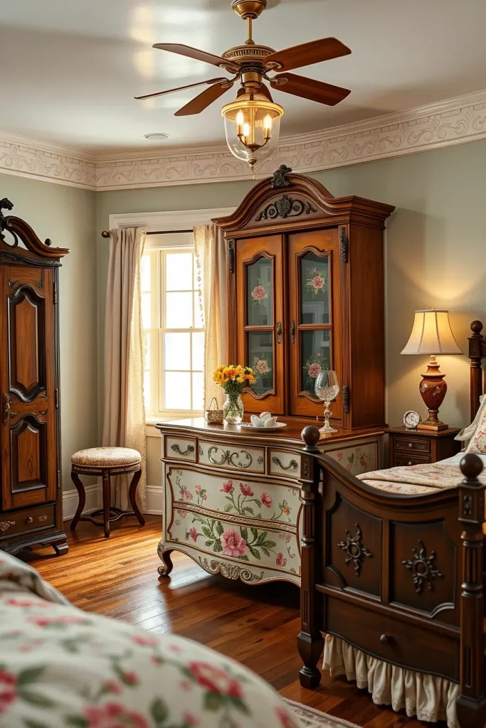 If you need storage space in your bedroom, an armoire gives you a suitable place for clothes, sheets or your television. Because their unique design stands out, painted dressers work great as furniture in guest bedrooms or entryways. I find myself attracted to soft greens, dusty blues and creams as distressing is minimal. Typical for Southern pieces are floral, vine and gold leaf designs and adding curved feet or brass knobs completes the appearance.
