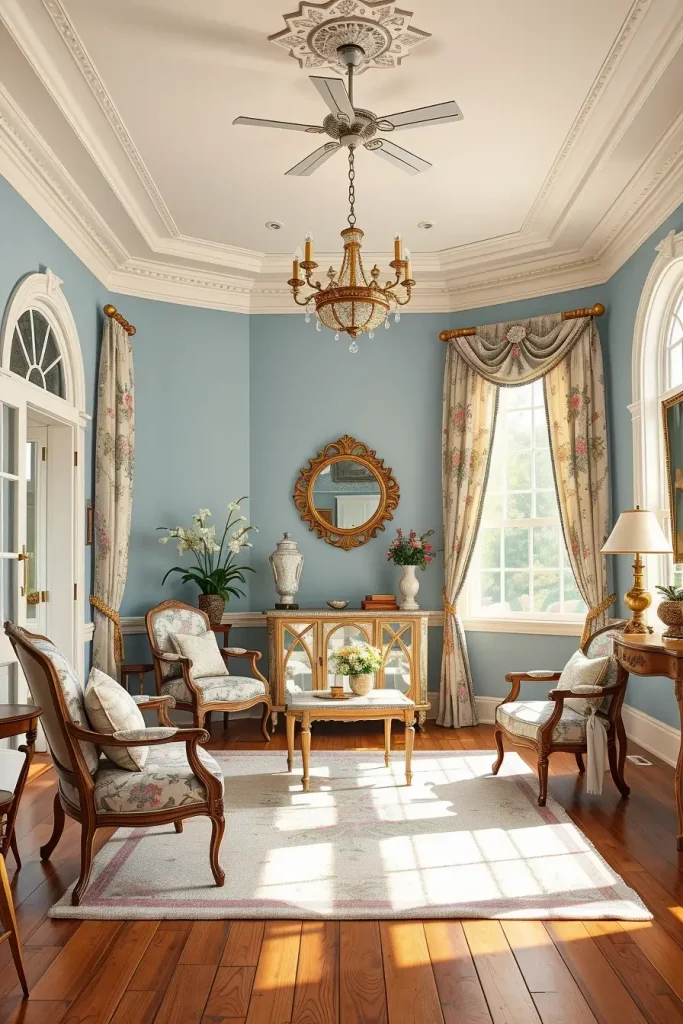 A beautiful lantern-style chandelier over the table, along with soft white-shaded sconces, is my favorite in Southern dining rooms. In a matter of practicality, bedrooms and living rooms are the best places for fans to be, especially if they complement the woodwork or trim. You can fill your room with fans that have wide wooden blades and classic pulls to make it interesting.