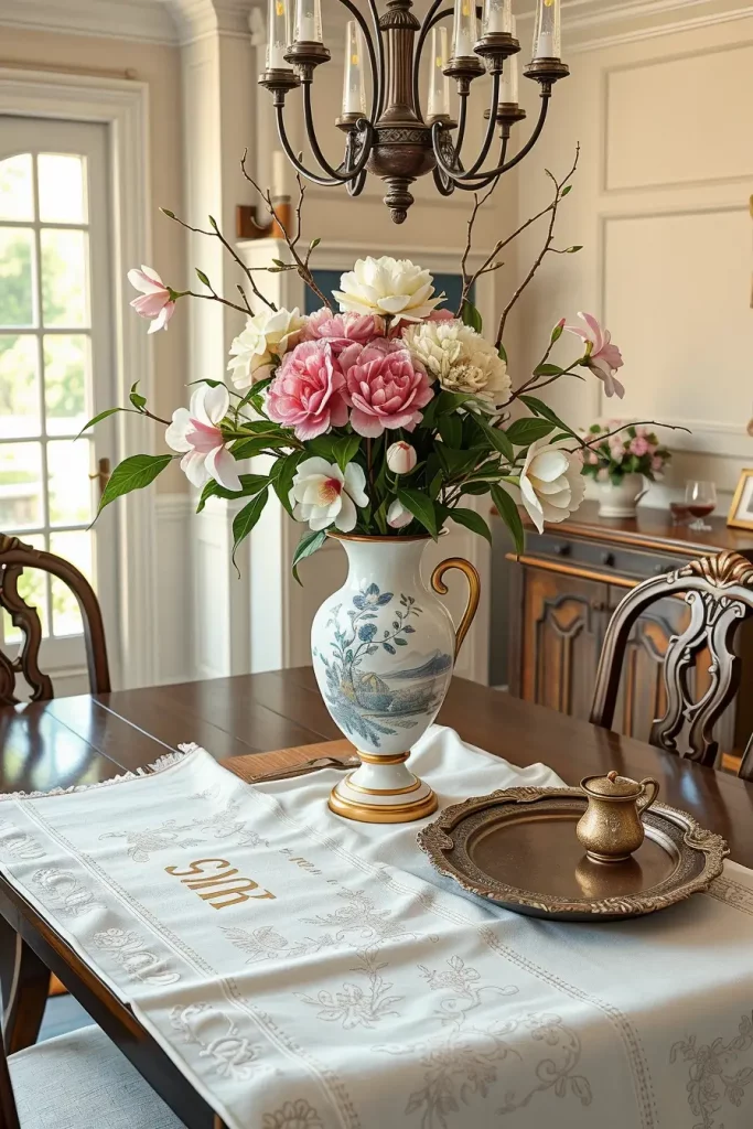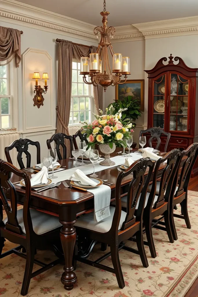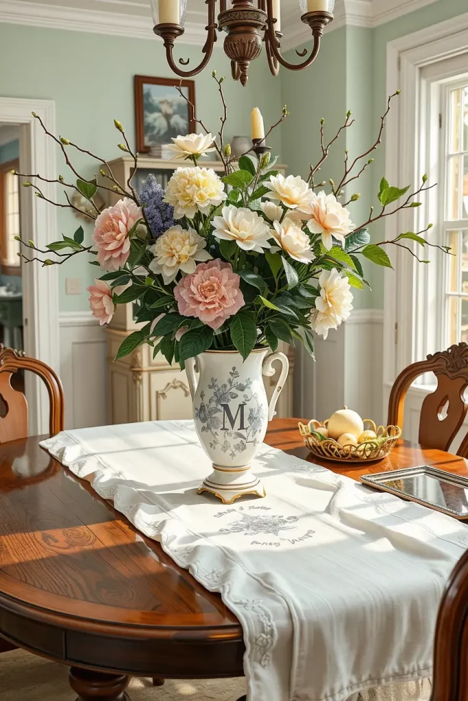 Monogrammed items on the table such as runners and napkins, can make your dinner more pleasant. I find myself putting ivory or white linens beside pale, embroidered fabric, choosing sometimes to mix in gold or navy. Do not let the look be loud or over the top. Place a few crystal goblets, bring out the silver flatware and put a tiered centerpiece in the center and your dining room is ready for a Sunday meal.