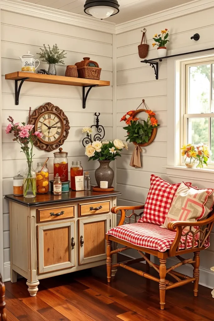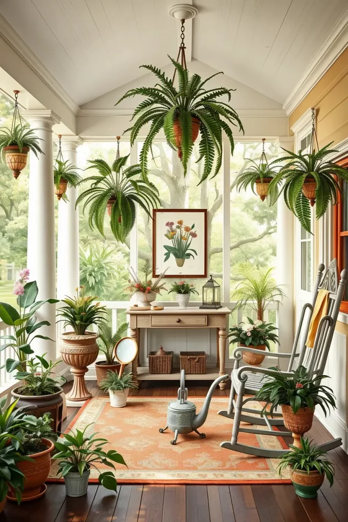 For this area, it’s a good idea to lay a small, patterned outdoor rug and place a wooden console table there to keep tea supplies and gardening items handy. A couple of antique planters can introduce more vintage charm to any room.
