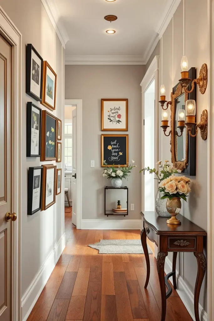 I would suggest using old picture frames, your best silver or some recently cut flowers at the top of each piece to let the area seem warm and appreciated.