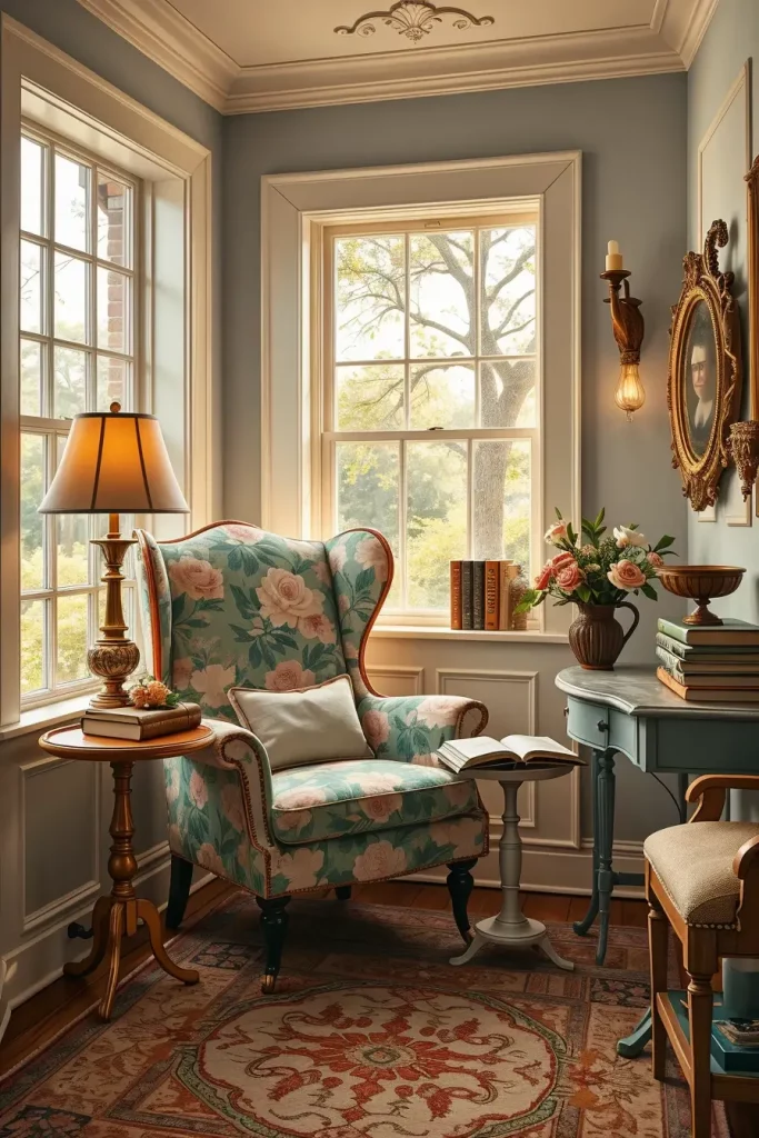 Making cozy places to read is something I’ve always valued in the South. At these small reserves, visitors can stop, think and even share tales with others. The star of a French Rococo living space is often a wingback chair upholstered in linen or floral cloth. There’s always a nice small table, antique reading light and a pile of favorite books close by.