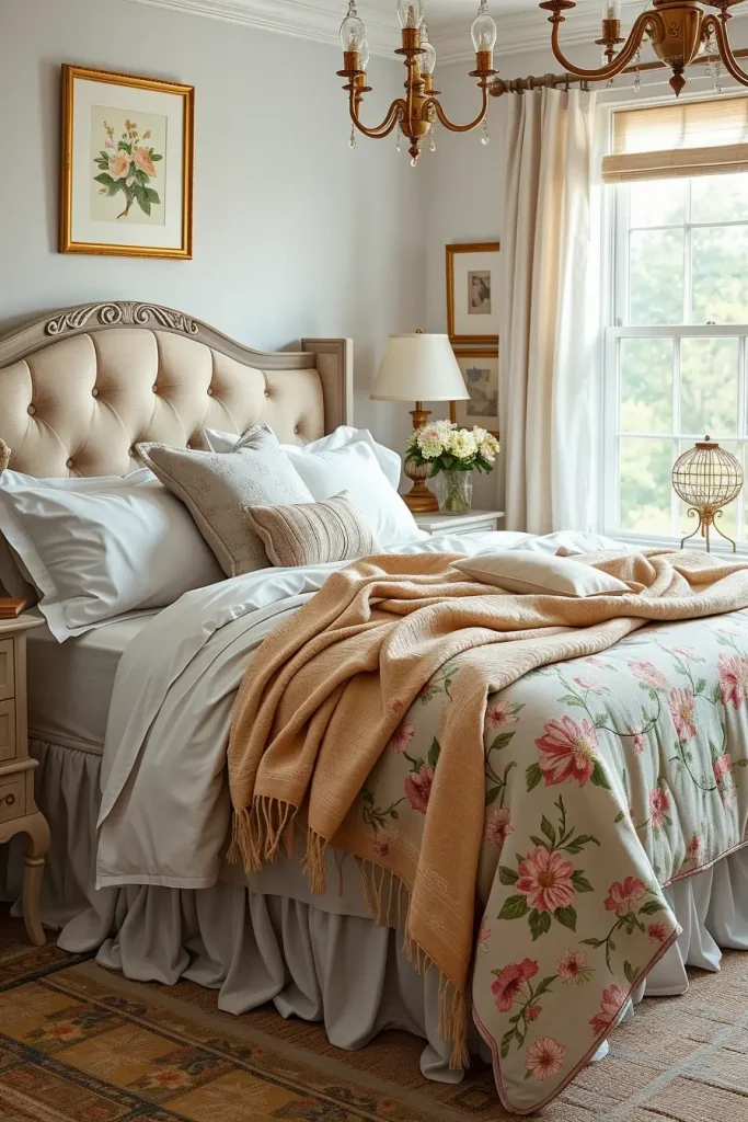 My bedside table has a brass lamp and I place a wooden chest or bench at the foot of the bed, along with botanical-theme wall prints. The combination of formal and friendly details is what brings success to the interior. Curtains with lace at the border are a lovely extra touch.