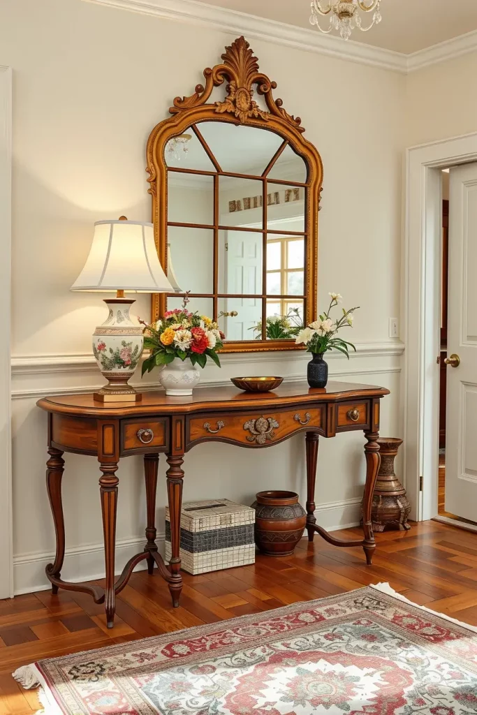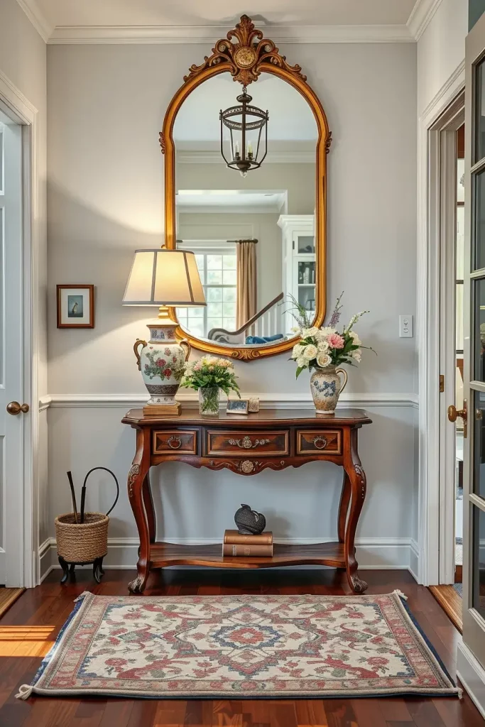 How a Southern home’s entryway looks influences the rest of the décor inside. Usually, I choose an antique console table made from shiny dark wood with a small amount of ageing. It right away creates an atmosphere of history and sophistication. A vintage rug and a gilded mirror make the area stand out and clearly reflect personal style.