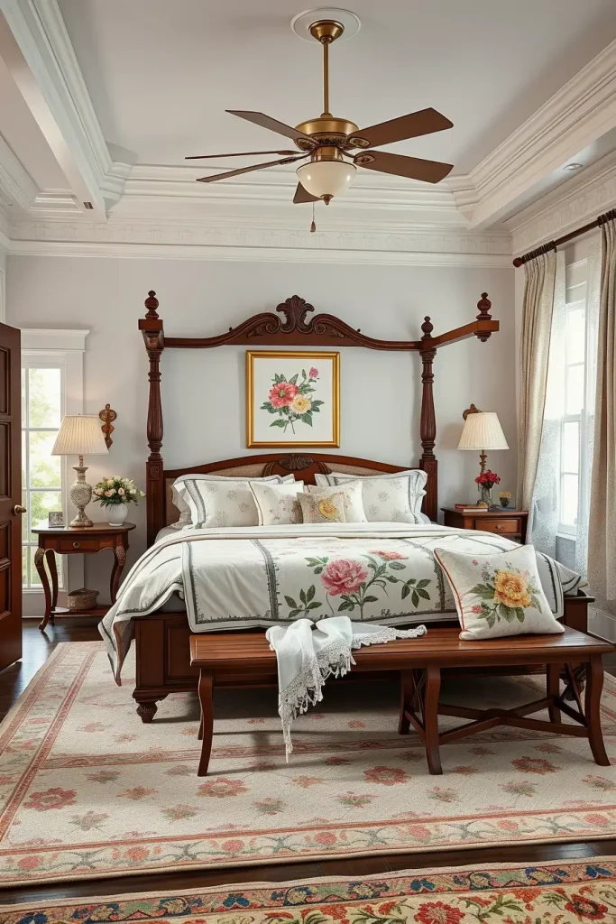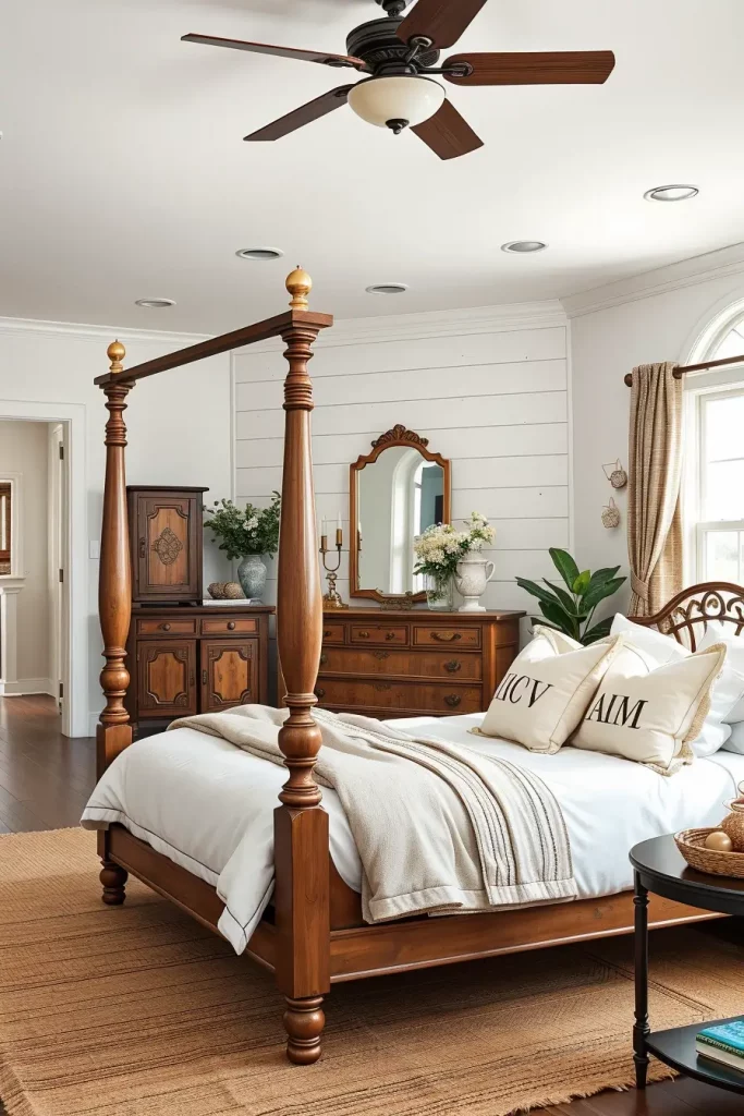When I am designing this kind of room, I could choose a traditional four-poster bed and use streamlined nightstands or hang an abstract painting above an accent wall of shiplap. The difference in finishes is the main focus—grand trim with simple furniture, shiny knobs contrasted with color on the cabinets. Make sure the wood elements and traditional heirlooms are complemented by a few up-to-date things such as cotton slipcovers or jute rugs, to keep it fresh and useful.
