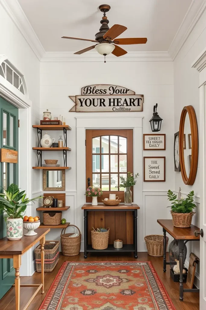 Having vintage signs or well-loved Southern expressions on the wall boosts the Southern character of any home. Often, these decorations add comfort and memories to a room, thanks to inspiring or playful written quotes. I tend to set them out in places like entryways, kitchens and laundry rooms, where they best match the conversational way I designed them. Whether new or old such signs are typically packed with charm.