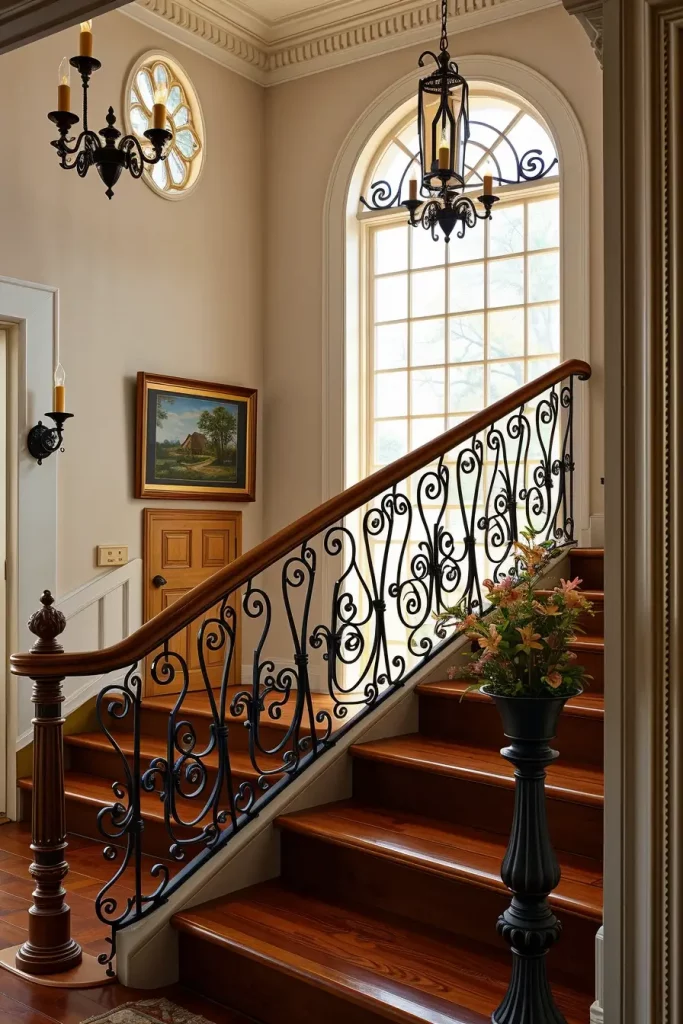 I’ve used black and oil-rubbed bronze finishes, sometimes with wood to make the room more balanced. A stunning vintage railing makes a staircase extra impressive. Traditionally Southern Gothic homes benefit from wall-mounted iron candle holders or decorative panels.