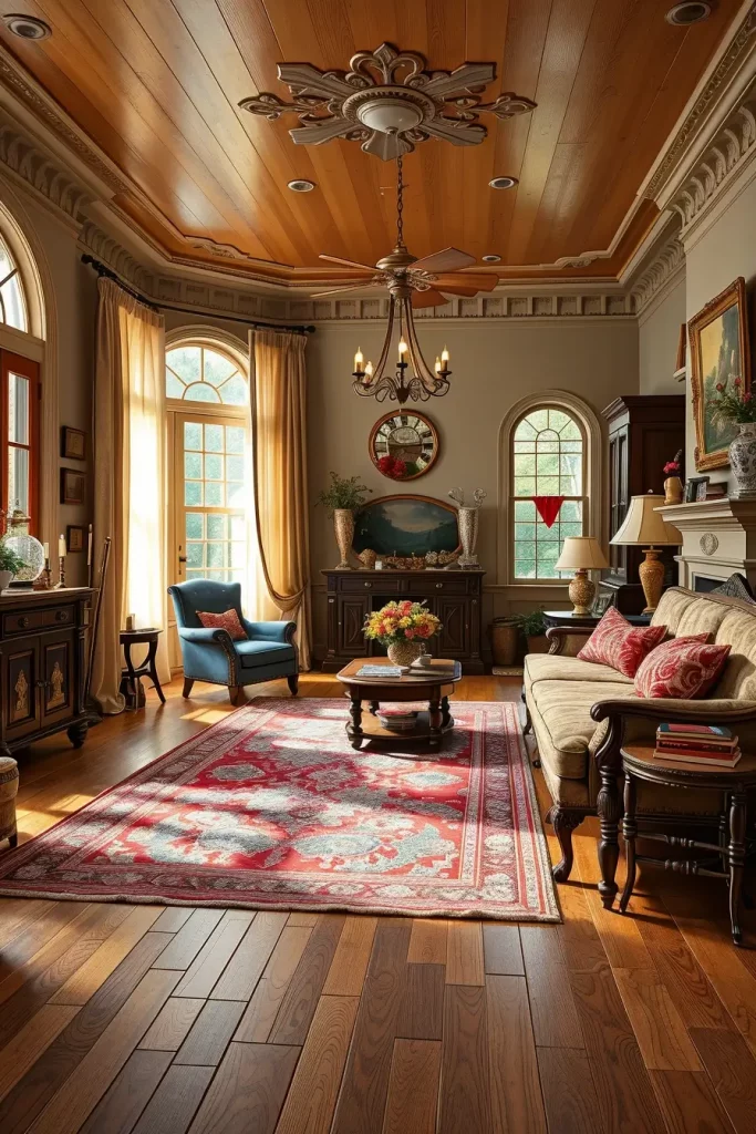I generally prefer to suggest unfussy stains such as walnut or golden honey and attractive rug patterns in shades of red, blue and cream. When worn together, the pieces immediately show class and history. A rug shapes the room and keeps the floors clean.