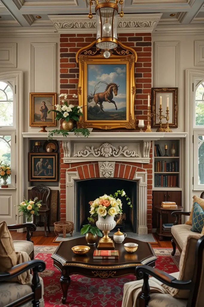 Whenever I decorate the mantel, I include gold frames, tall candlesticks and beautiful flowers. An interesting object over your mantel draws the eye up, whereas art pieces and layers add a stylish feel to the space. Stacking wood fire in a brass basket or fire screen often makes my home warmer and cozier.