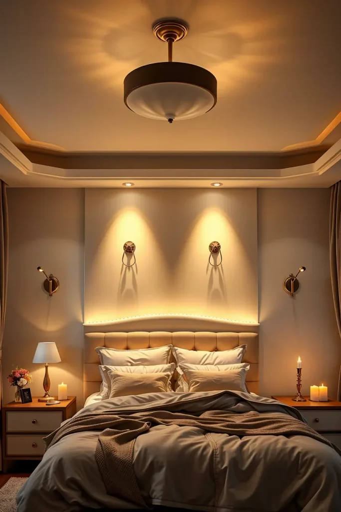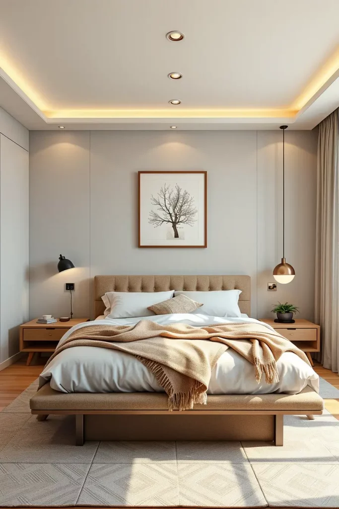Furniture and decor also contribute to this. Wood nightstands are matched with brass or matte black lamps. Subtle lighting is provided by string lights or soft LED strips that are placed behind headboards. Real or LED candles will always be timeless accessories that add instant warmth.