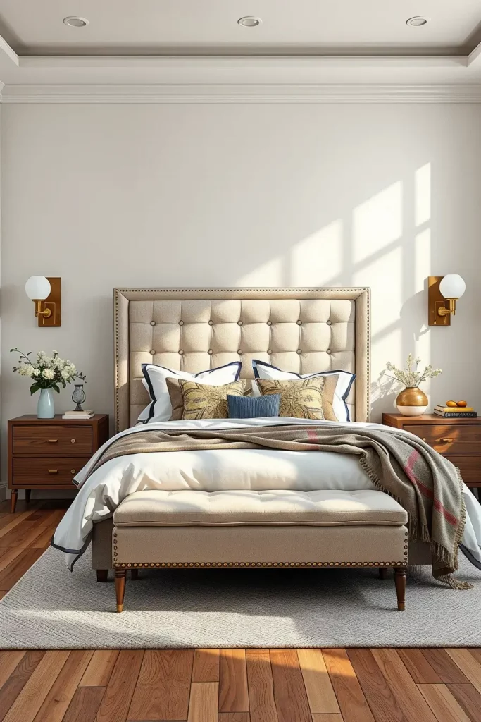 In choosing furniture, I usually opt to buy headboards that are covered with linen, velvet or bouclé fabric. A white headboard will suit a wooden bedside table and stacked bedding. To give it a little extra, tufted patterns or small patterns may be used to give the appearance without overpowering the room. The ensemble is matched with the matching of upholstered benches at the end of the bed.