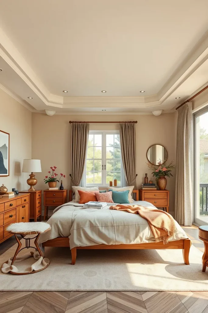 In furniture selection, I would suggest to use light wood coloring with upholstered furniture in neutral color. As an illustration, a bed frame, nightstands made of natural oak, and linen curtains can prepare the environment of coziness. The use of accessories in dull blues or blush pinks makes sure that the palette does not look too monotonous.