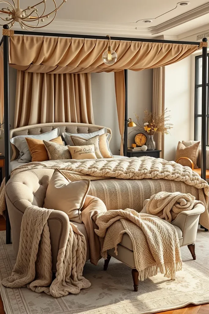 To make it even cozier, I would include a canopy bed frame, where the throws and pillows will be included in the overall display, and the sense of comfort is increased.