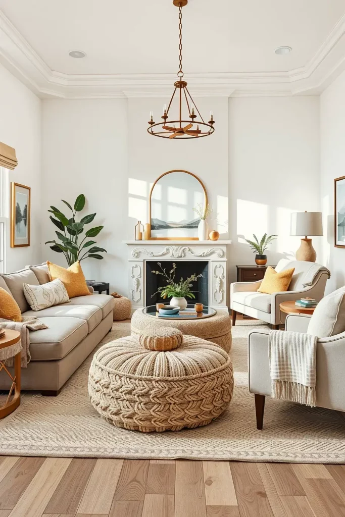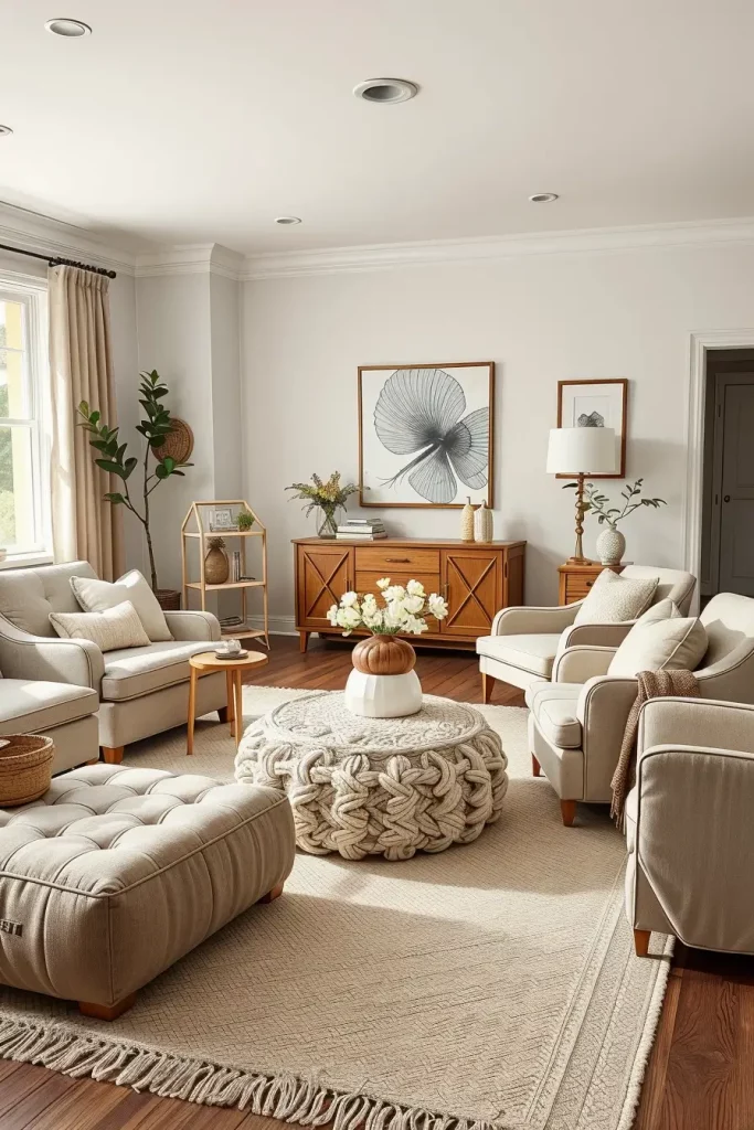 When I create a warm, inviting neutral living room space, I always use basic comfort items as the starting point and beige ottomans and poufs can be the most universal. They do not only add practical details, such as seating, footrests or even side tables, but also introduce the diversity of textures, which establish the mood of the room. That decorative element is like having another layer of texture in a sea of soft neutrals, so it keeps the space form being flat.