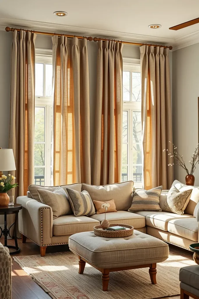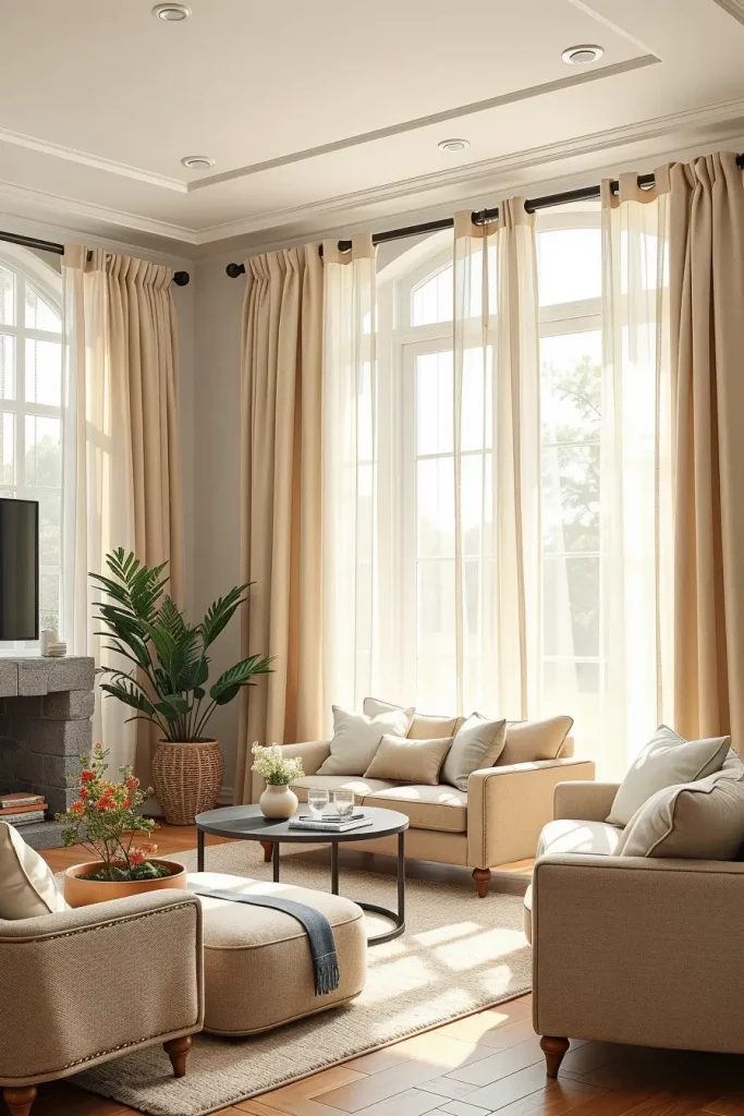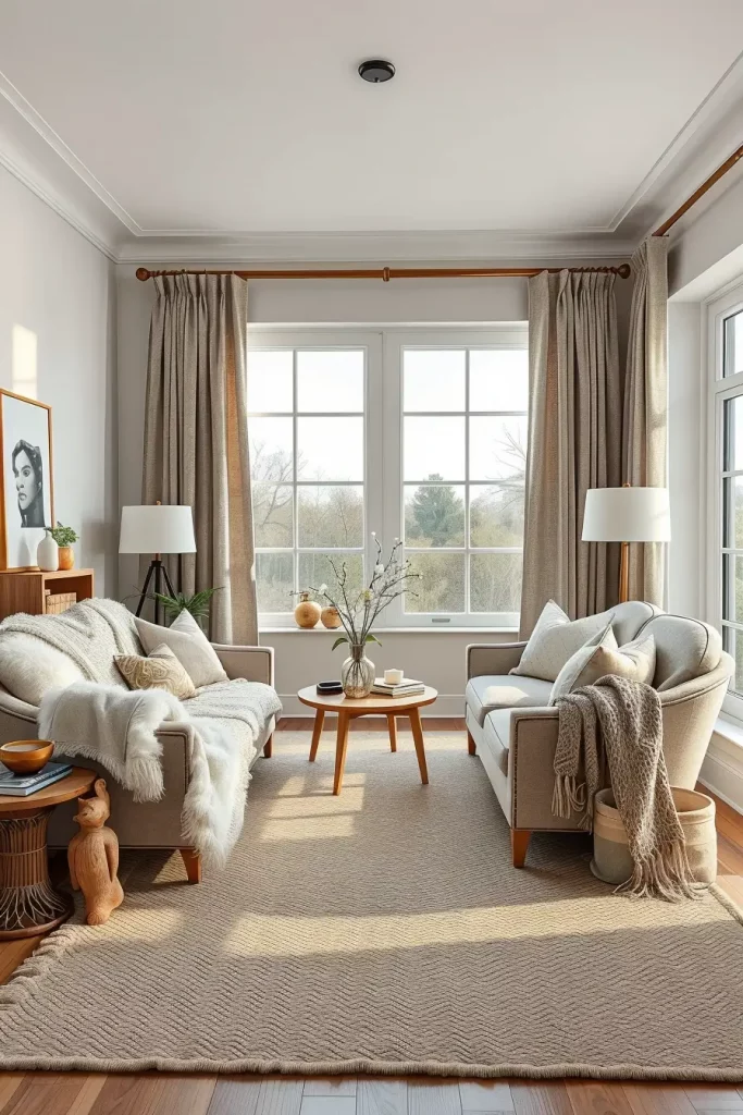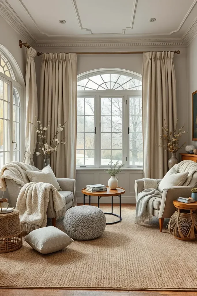 I’ve always found that the right window treatments are like the frame on a painting—they complete the space. Another tip given by Studio McGee is that it is always better to use light warm neutrals on window dressing in cozy living rooms in cases of layering shades of beige, gray, or ivory. Based on that philosophy, I employ texture and color of curtains to improve softness and comfort.