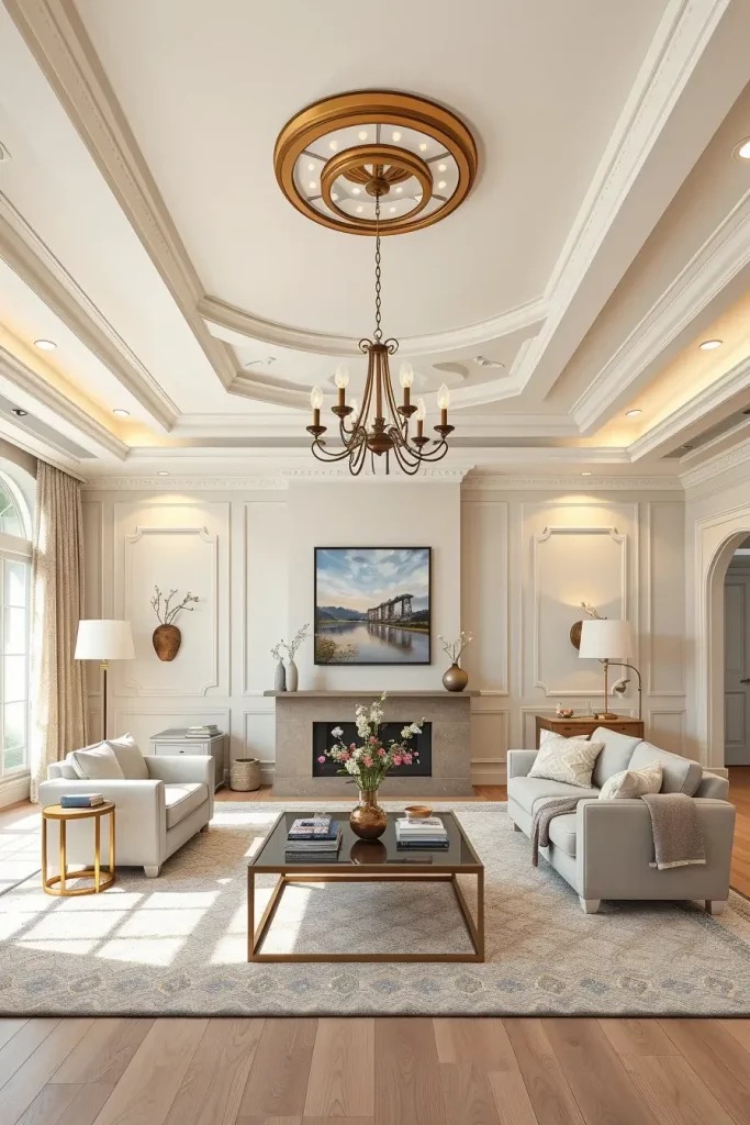 To add more to the contribution of the ceiling, it would be good to think about soft LED down-lights or a contemporary flush chandelier in a matching neutral shade of linen.