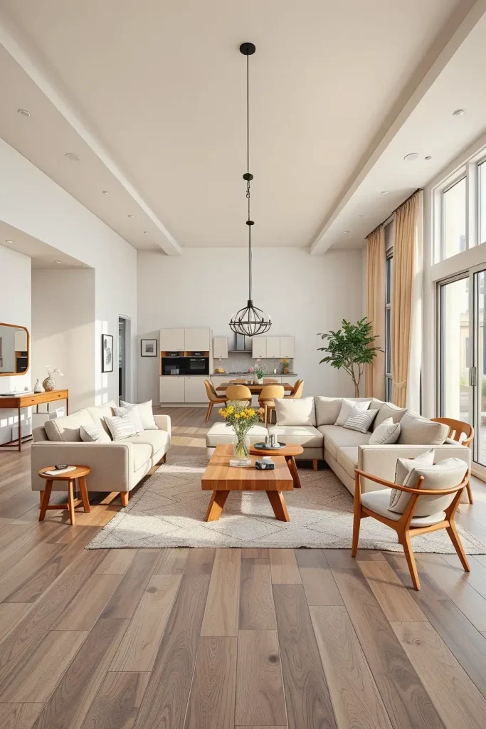 I prefer to delineate the place to live with inoffensive area carpet something in taupe or oatmeal to make it feel down to earth. A soft colored cream or light gray U-shaped sofa will also define the resting area but, at the same time, be open to the rest of the design. Such additions as a huge coffee table, warmed in oak color, keep the area in balance and at the same time, neutral curtains serve the purpose of softening the window lines all along the wide walls that are more open.