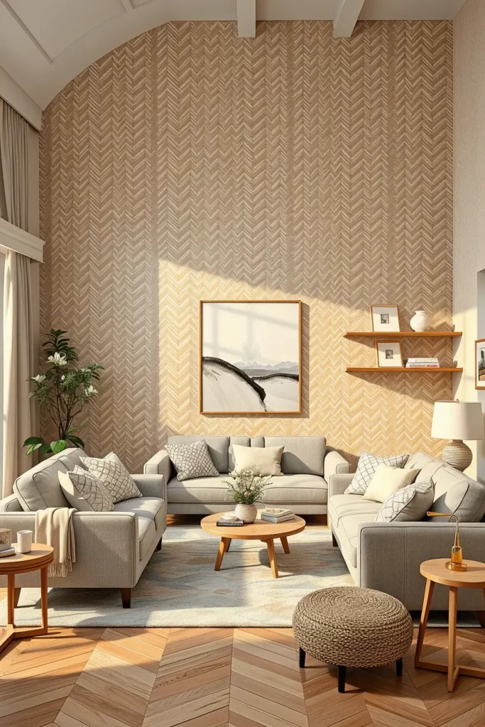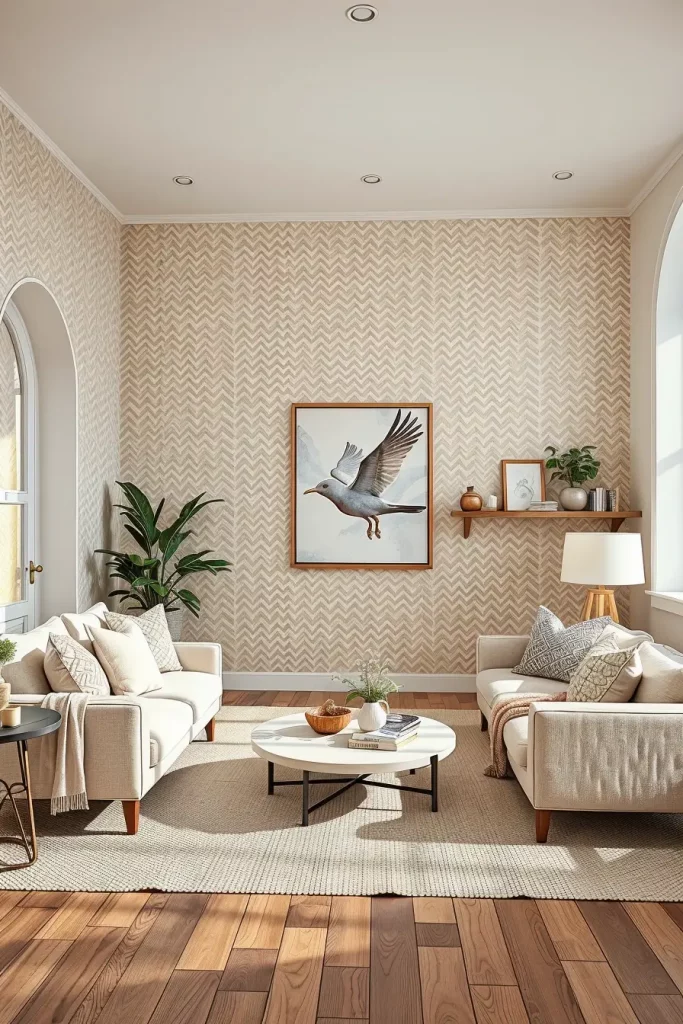 My favorite tip is to use neutral wallpaper to give interest to a room without getting overdone. It can be as simply geometric as the wallpaper in beige or taupe, whether it is as subtle as a geometric design, as linen-like as a texture, or as natural as grasscloth, wallpaper offers a muted background and a hushed elegance. This method is warm and layered in a small neutral-toned living room.