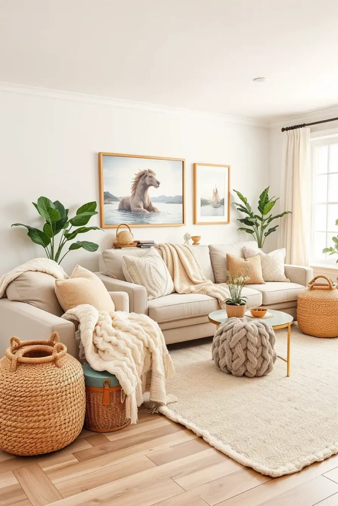 Layered blankets and woven baskets are one of the ways of creating a warm and neutral living room in a shortest period. They will add ease of touch and functionality to storage in the most stunning manner possible. I have a neutral color scheme: ivory, oatmeal, tan and the textures vary so that the space appears lush and accommodative.