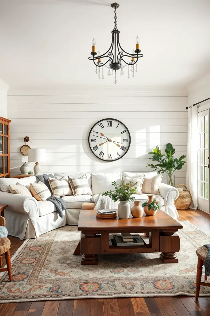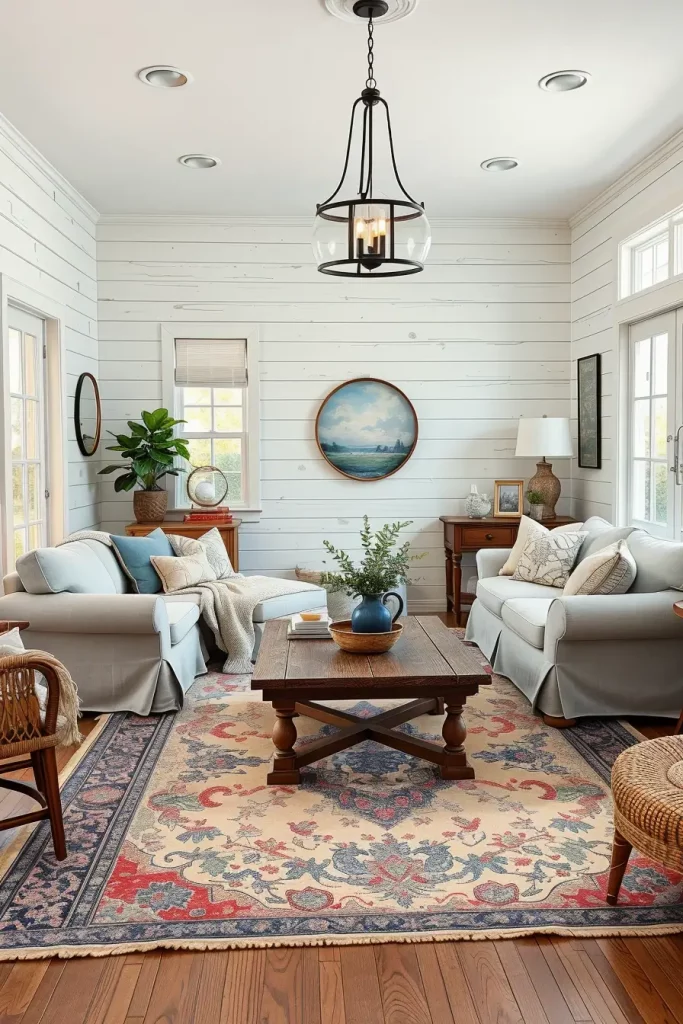 I always add slipcovered sofas, shiplap walls or beams on ceilings and metal or iron lighting. The room is anchored by the wooden coffee tables with unfinished edges or antique-finished and together with the vintage rugs of faded color pull the whole setting together. That comfort of that reclaimed effect is to combine new and old by selecting vintage items in conjunction with new furniture.
