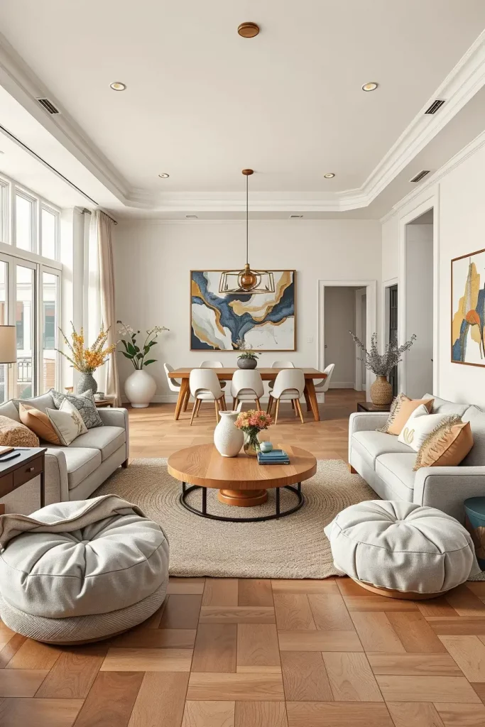 I select the furniture that has soft lines, the arms of the sofas are rounded, coffee tables are oval-shaped, and the accents, such as poufs or side tables, are curved. Using natural materials (oak, jute, brushed linen) will contribute to uniting the area. To highlight I have used the slight differences in shade and subtlety of texture instead of contrasting elements. An abstract wimpy painting or a line art on the wall not only extends the palette but it also gives personality.