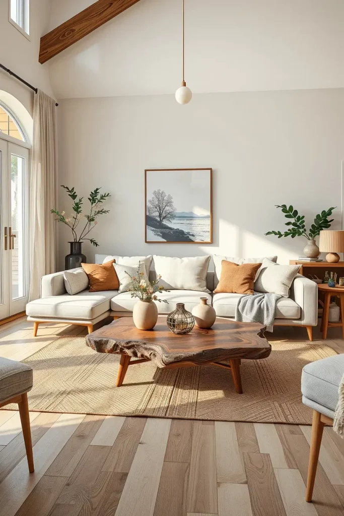 I prefer having rounded tables, soft materials, and tables that have a low profile to help keep the flow and rest. A rustic live-edge table has an edge, and a clean-lined Scandinavian table has got a modern sophisticated touch. Include one or two style elements such as a ceramic vase with a earthen color, some books on the coffee table or a small piece of sculpture to create a warm and yet non cluttered mood.