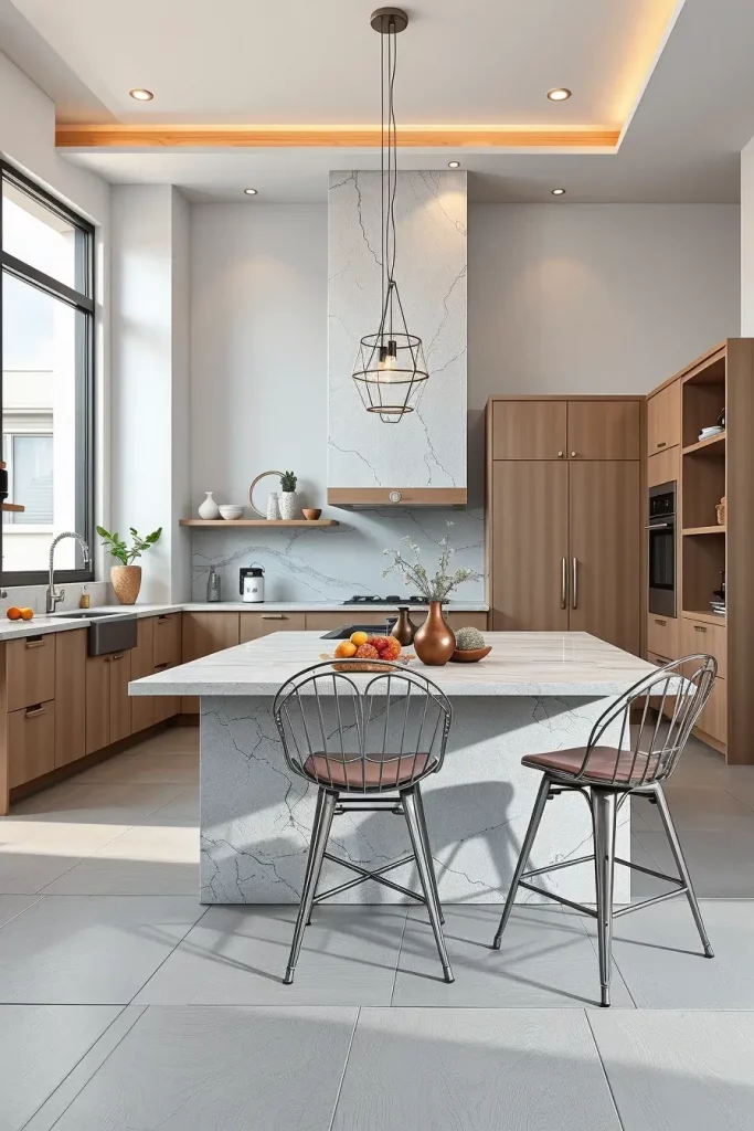 I choose metal chairs of elegant profile, rounded edges and powder-coated surfaces. I incorporate them since metal has a sense of permanence and a smooth look as well as it can support the concept of modern kitchen island chairs which is based on stability and aesthetics.