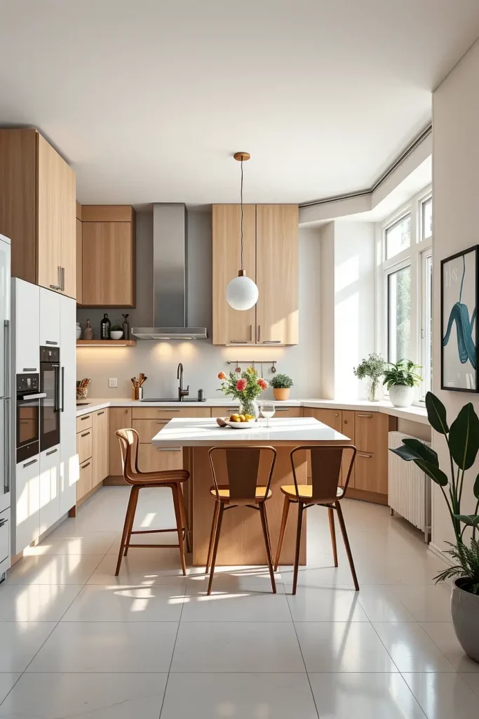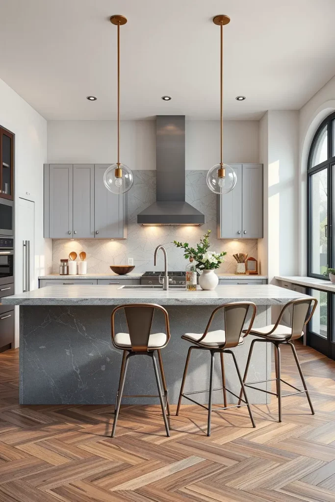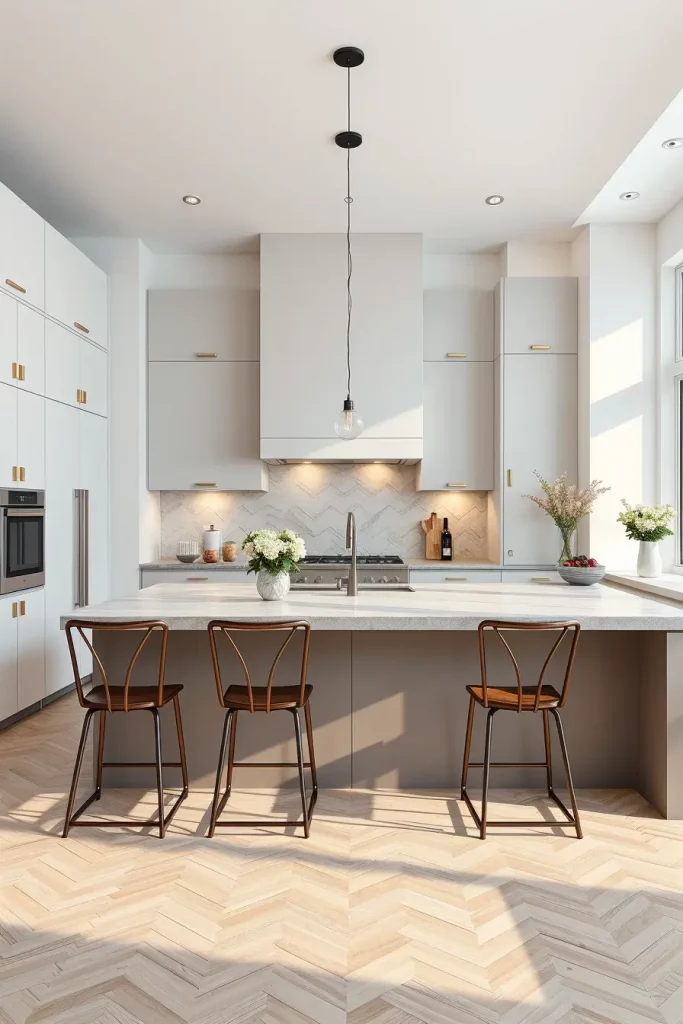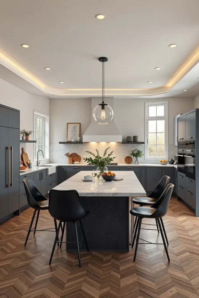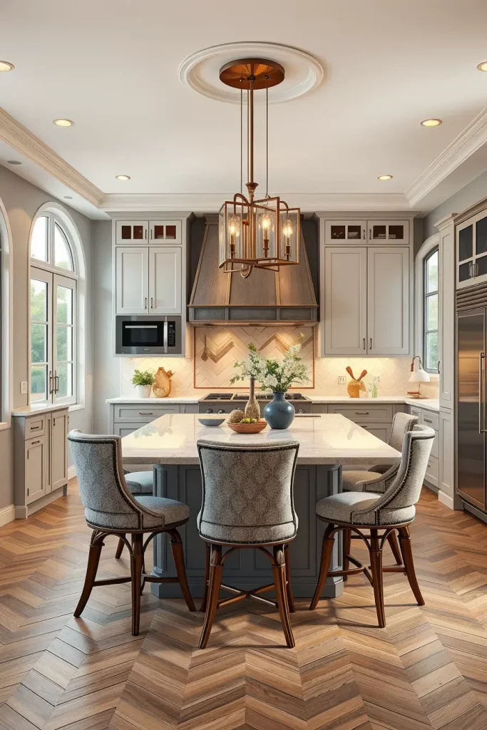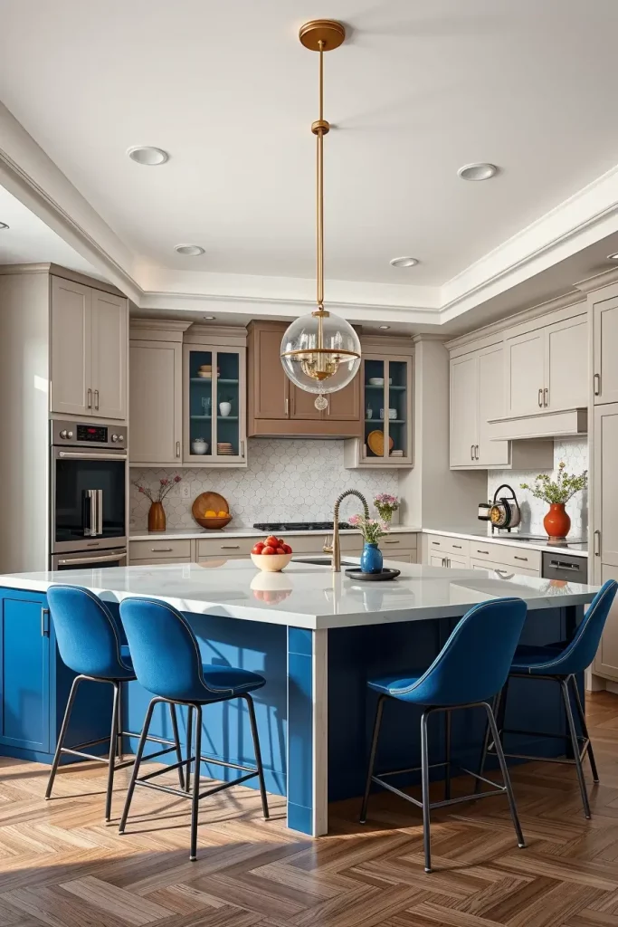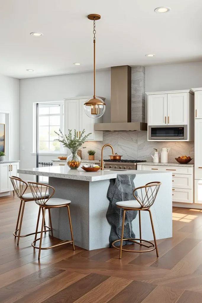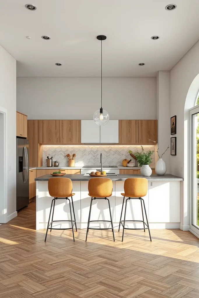 To fill this section, I would provide suggestions on matching geometric chairs with basic bar stools at secondary counters, not to be monotonous.