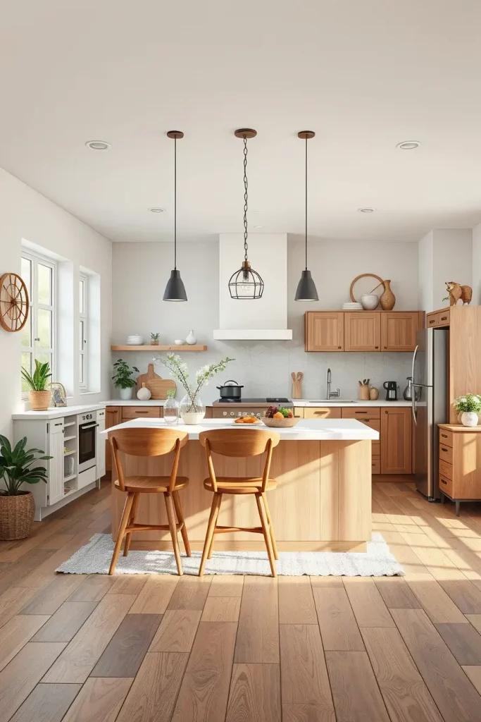 The advice I would put in this part is about repetition. I would propose to repeat the one of the chair materials in another place in the kitchen, i.e., shelves or lights, to provide visual consistency.