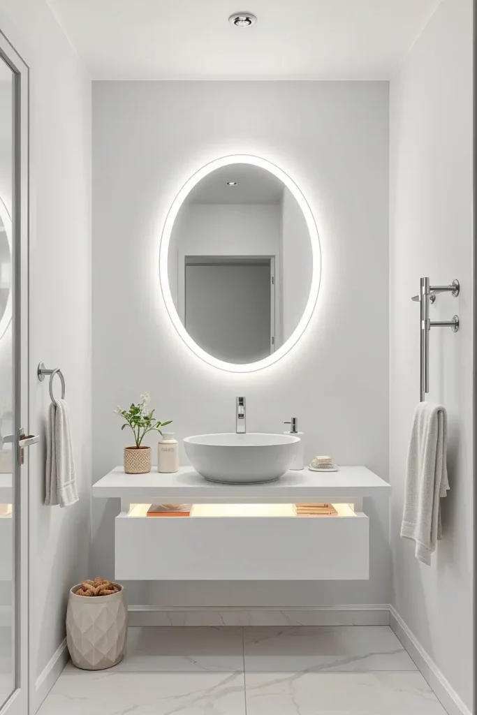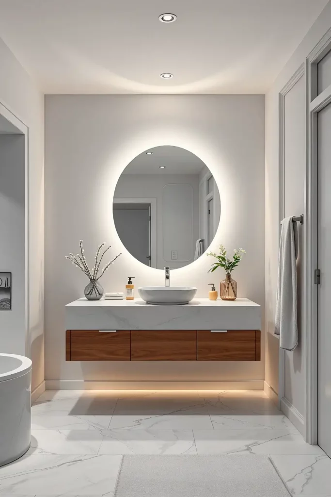 There are round, square and pill-shaped backlit mirrors in different shapes and sizes several with adjustable color temperatures and dimming features. On many occasions, I make use of the under-vanity LED strips or vertical lights on both sides of a mirror. These not only better the visibility but also help in the general ambiance of the room.