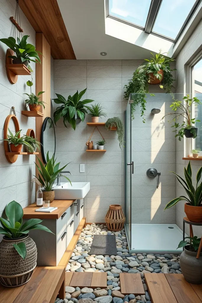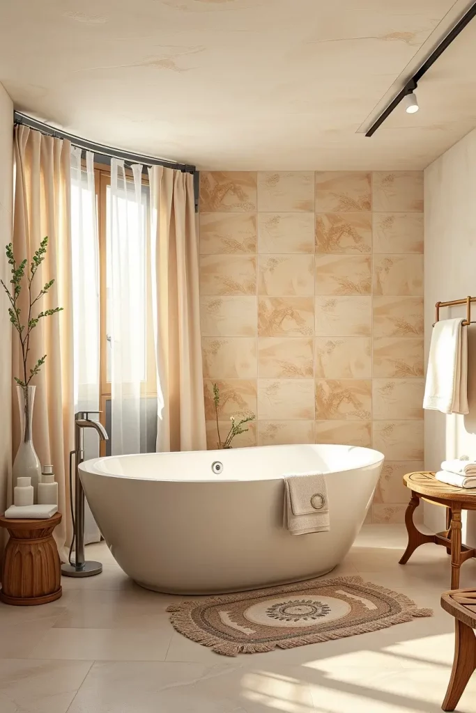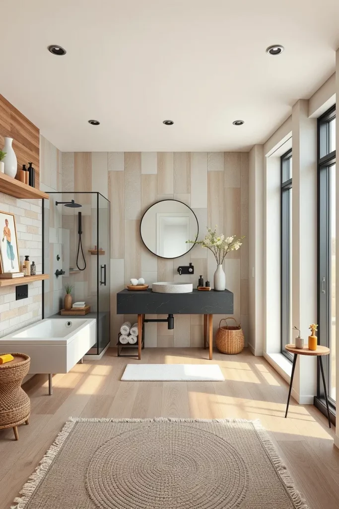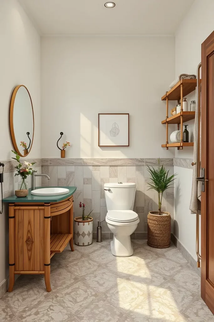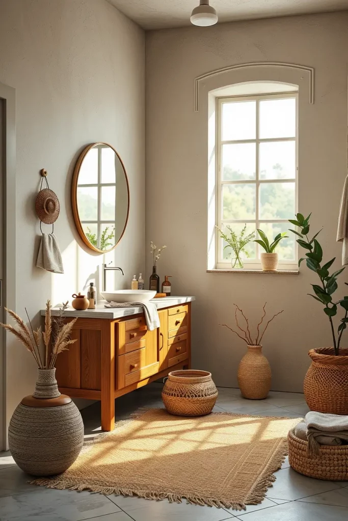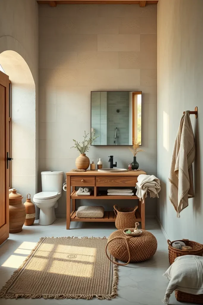 Just to give an example, I have adored a wooden vanity with a stone sink and I would match it with jute mats, basket weaving, clay vases. Mirror frames that are composed of reclaimed timber even personalize the space. I even choose textured walls such as a limewash or Venetian plaster to eliminate the monotony of rooms that are filled with tile-heavy rooms.