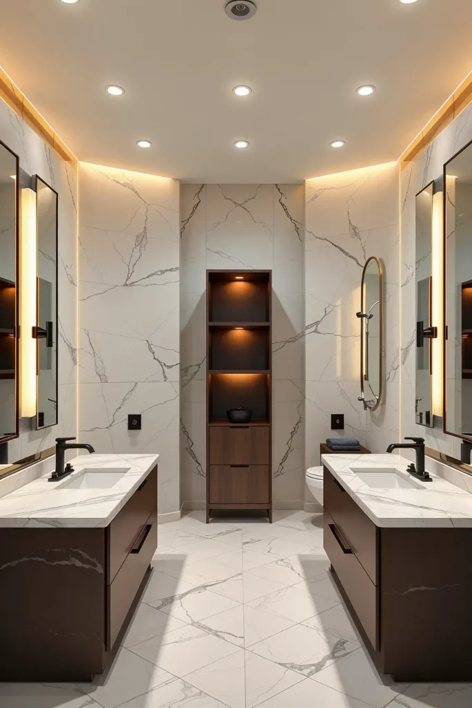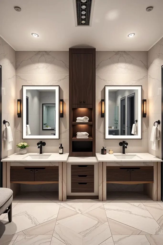 My favorite design entails a symmetrical cabinet, a symmetrical mirror, and built-in lightings. Things such as quartz or marble plating countertops and specifically designed storage areas underneath make the design classy and functional. I normally fit in-common tower or in-set shelf to place the regularly used things.