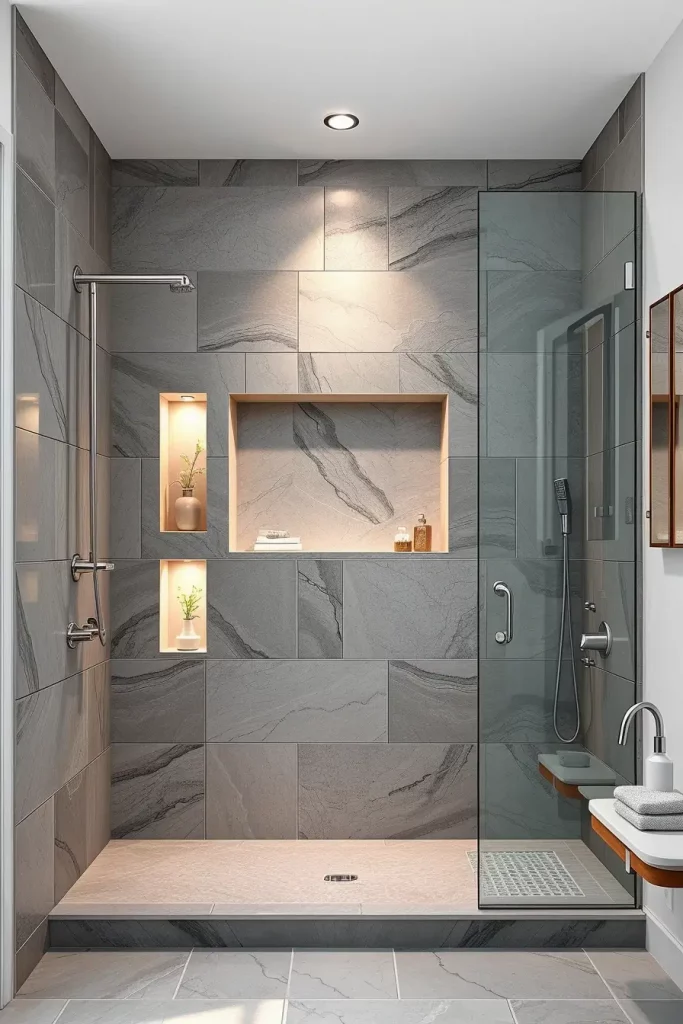 The typical construction materials are matching tile or accent tile and LED lighting. I would normally advise tall vertical niches which have three sections in which we can store shampoo, soap and decor. Mirrors that feature recessed cabinetry or those that are placed within the walls that are around the sink also look fabulous.