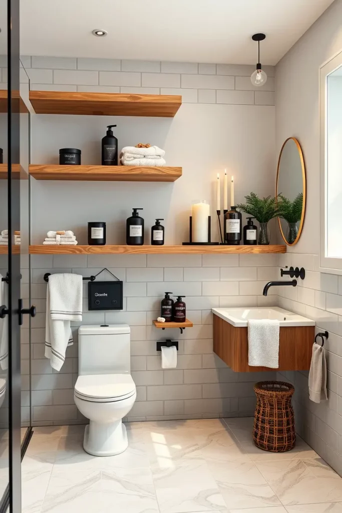 I would only suggest 2-3 shelves at the max giving equal spacing and similar containers in the toiletry. White-tiled rooms are contrasted with walnut or matte black shelves, whereas oak is brighter and works with earth tones. The idea is to stay in the middle ground of functionality and display.