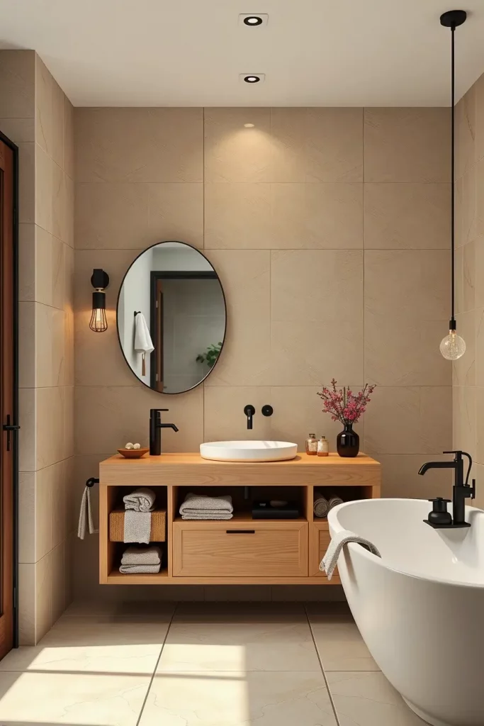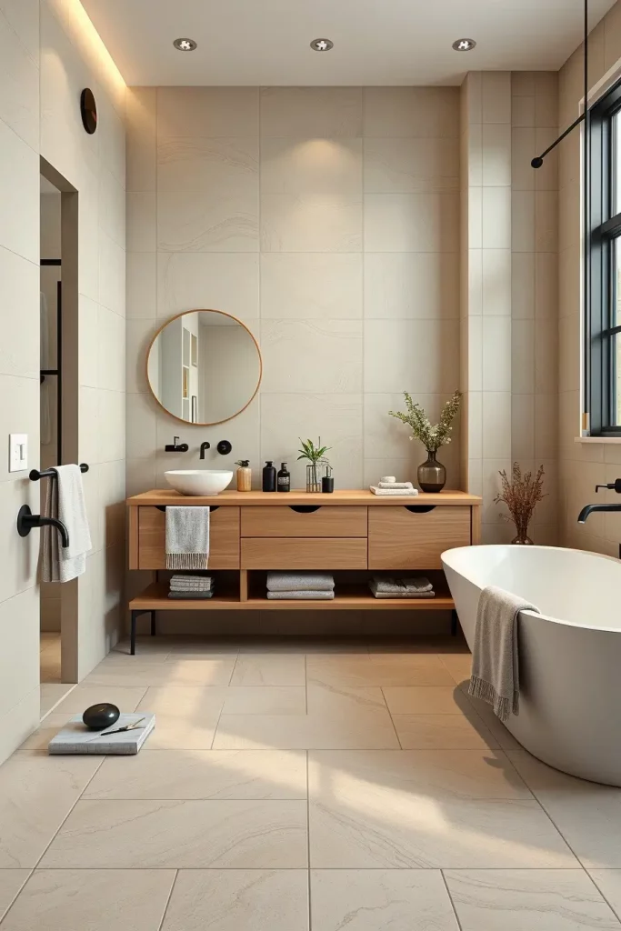 The main materials used are light wood, textured stone, brushed brass and matte ceramics. I tend to add floating vanities covered with natural oak and soft beige tiles and warm grey walls. Matching them with stand alone bathtubs and modern black decorative lighting complements the look to keep the appearance clear and minimal. There are very few accessories (generally a stool, a linen towel, and a small live plant).