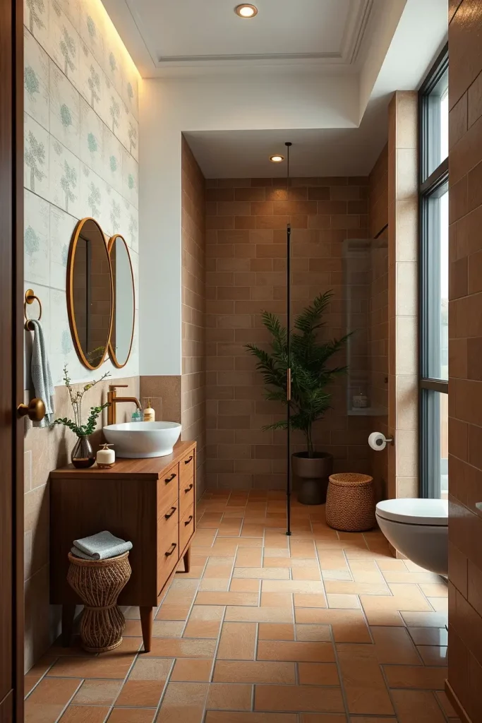 My wall and floor finish of choice is large format terracotta, olive green, greige and soft taupe tiles. To contrast that, I introduce white basins, cream-colored stone countertops, and wood vanities that will be in walnut or ash. The monotony can be secretly put at an end with a brass faucet or frame on a mirror, and all these keeping the earthy tone in proper balance.