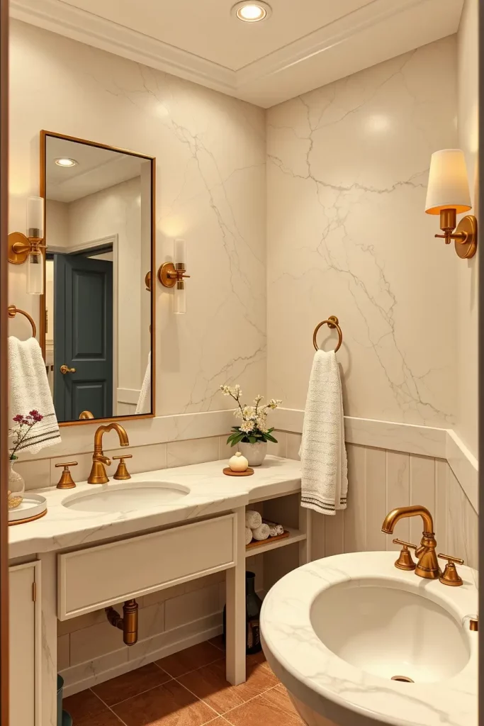 The use of gold and brass details is deluxe, but down-to-earth adding coziness to contemporary bathrooms. I pick finishes so that they are high end and also select them strategically much on things like my faucet, the frame of a mirror, a towel bar, and the lighting- to add a sense of the finer side of life without letting the space be wall to wall Napoleon finishes.