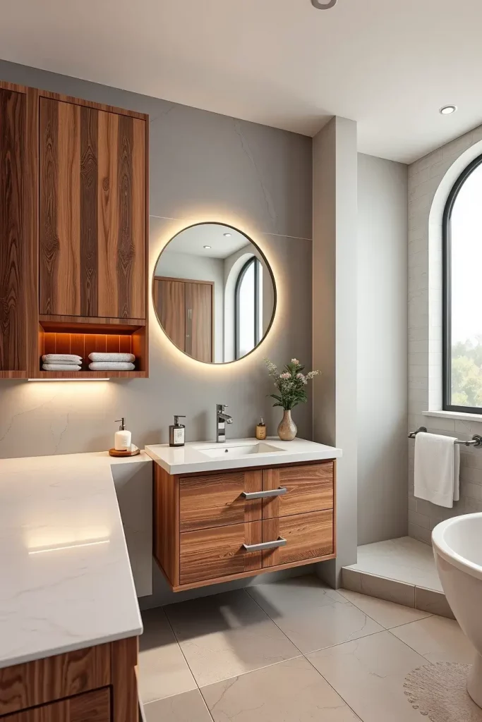 The thing is that visual warmth is commonly lacking here. I advise adding a vertical cabinet in the same finish for balance, or pairing the vanity with a large mirror that has a warm wood frame to prevent the space from feeling too “clinical.”